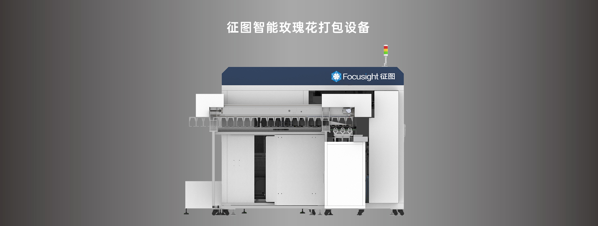 接料工位精準(zhǔn)接收夾送機(jī)構(gòu)輸送的鮮花;收攏工位通過(guò)壓力傳感器實(shí)時(shí)調(diào)節(jié)花束松緊度,確保不同大小的花頭,其花束松緊度相同;扎梗/切梗工位,采用更優(yōu)的彈性橡膠帶和卡釘,對(duì)花束進(jìn)行自動(dòng)扎緊;并根據(jù)攝像機(jī)拍攝的花枝長(zhǎng)度數(shù)據(jù),自動(dòng)調(diào)整切梗位置,并匹配客戶要求的出貨長(zhǎng)度進(jìn)行切梗;包裝工位則根據(jù)攝像機(jī)拍攝的花頭大小,自動(dòng)調(diào)節(jié)包裝的高度和包裝紙長(zhǎng)度,對(duì)花束的四條邊順序進(jìn)行穩(wěn)定的包裝,并采用高強(qiáng)度快干膠水進(jìn)行牢靠的黏貼。